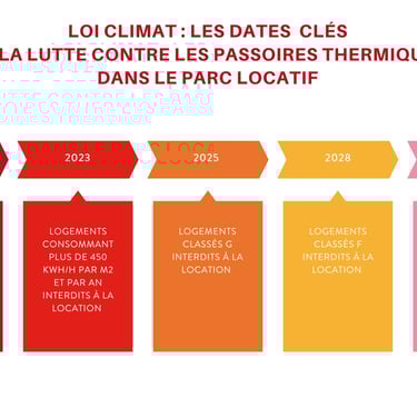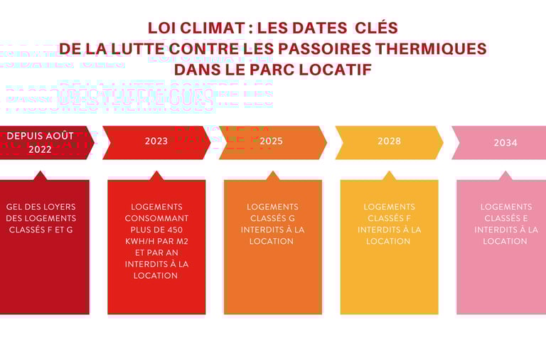 ÉchéanceCe que dit la réglementation (décence énergétique)Concrètement pour un bailleurDepuis 01/2023Logement décent si conso < 450 kWhEF/m²/an (énergie finale)Les “pires” logements très énergivores ne devraient plus être remis en location sans travaux (Ministere Transition Ecologique)01/2025Doit être au moins FUn logement classé G ne doit plus être loué (nouveau bail + renouvellement/reconduction) (Ministere Transition Ecologique)01/2028Doit être au moins ELes logements F seront concernés (Ministere Transition Ecologique)01/2034Doit être au moins DLes logements E seront concernés (Ministere Transition Ecologique)